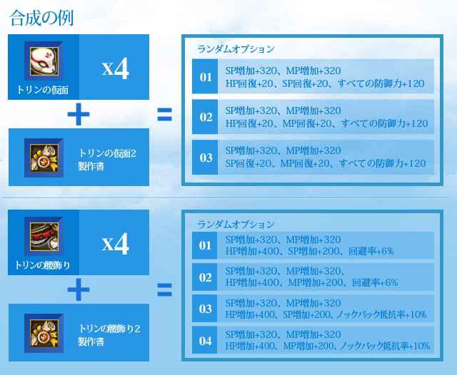 3つのランダムオプションのどれかが付いた、新アバター「トリンの仮面2」が製作可能。