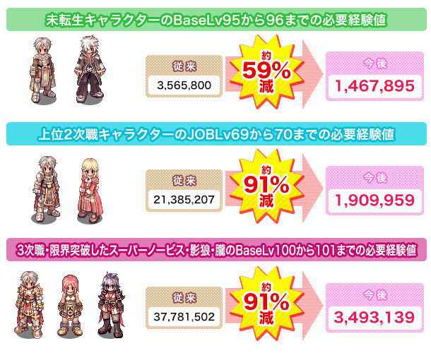 3次職と、限界突破したスーパーノービス、影狼、朧のレベル上限が開放される、2014年春実装予定の「レベル上限解放アップデート」に先駆け、Base経験値、Job経験値のテーブルを2013年12月17日(火)に変更いたします。 |