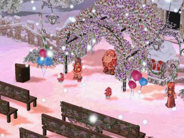 また、FINAL PHASEアップデート実装と同時に、最後のウィークリーイベントとなるウィークリーイベントFinal「クリスマスパーティー」が始まります。 フィールドには赤い帽子をかぶったクリスマスモンスターたちが出現するようになり、雪の降る幻想的な街ルティエではイベント期間限定の特別会場でロマンチックな結婚式を行えるようになります。 |