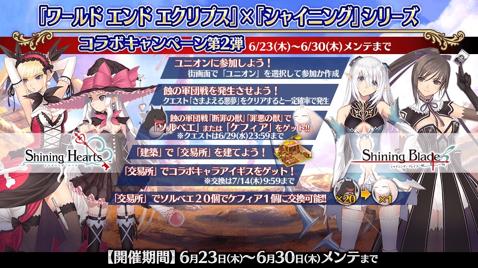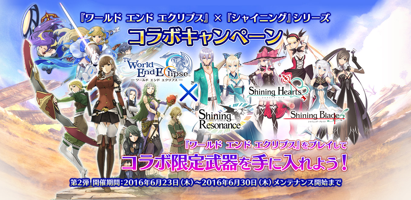 株式会社セガゲームス コンシューマ・オンラインカンパニーは、スマートフォンとPCでサービス中の完全新作オンライン RPG『ワールド エンド エクリプス』ゲーム内において、6月23日(木)より、同社の RPG作品「シャイニング」シリーズとのコラボキャンペーン第 2弾をスタートいたしました。