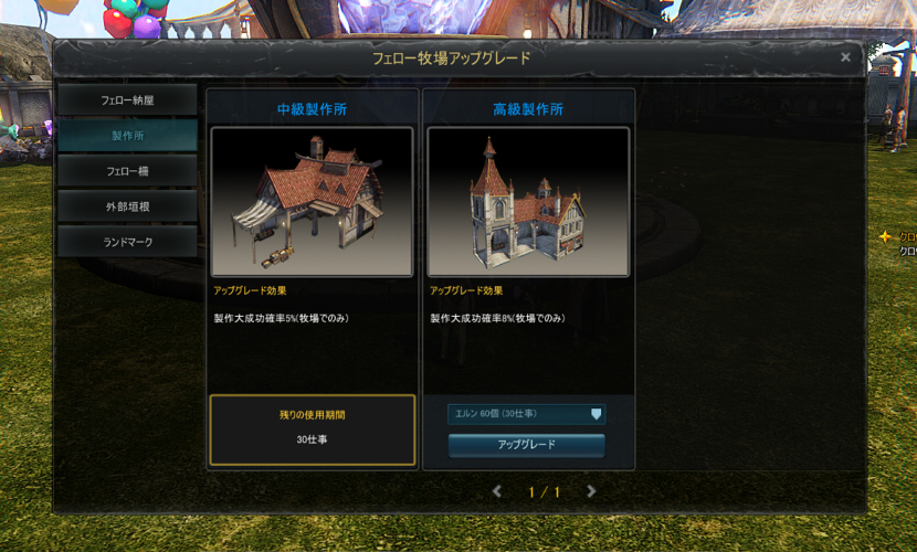 フェロー牧場内のアップグレード専用 NPC を通じ、エルンやフェローコインを消耗することで、牧場内のオブジェクトをアップグレードできます。オブジェクトのアップグレードによって牧場内の外見を自由にカスタマイズできる他、牧場内での製作大成功確率上昇等のバフ効果を得ることも可能です。