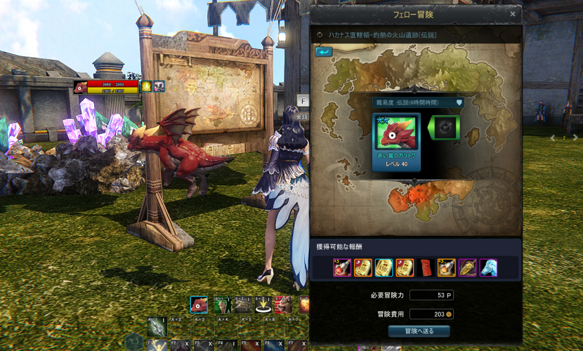 「フェロー冒険」システムでは、フェロー牧場内に設置されているフェロー冒険掲示板を通じて、所持しているフェローを冒険に旅立たせる事が可能です。フェロー冒険に旅立たせたフェローは一定の時間が経つと冒険先の地域で拾ったアイテムを持ち帰ってきます。
