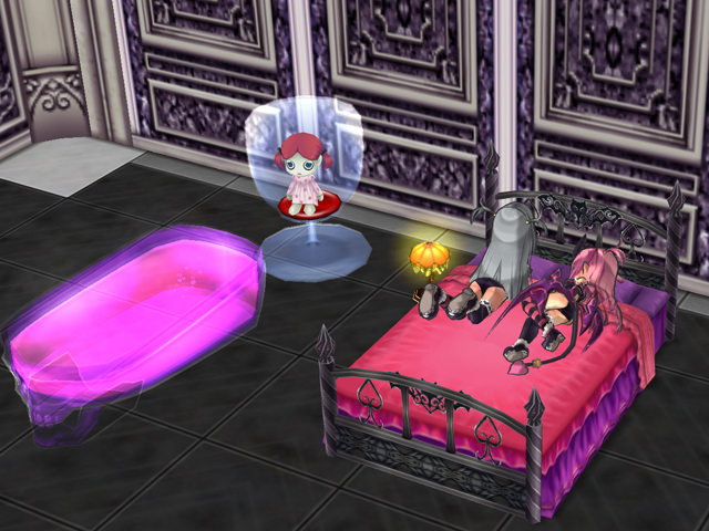 また、『小悪魔の添い寝ベット(紫・リリム有)』や『スケルトン・バスタブ(赤)』『ワイングラスチェアー(赤)』『魅惑のルームライト(赤)』『ゾンビのぬいぐるみ(赤)』で自分だけのお家『飛空庭』を飾れば、ファンシーながらもどことなく魅惑的なお部屋を演出することができます。
